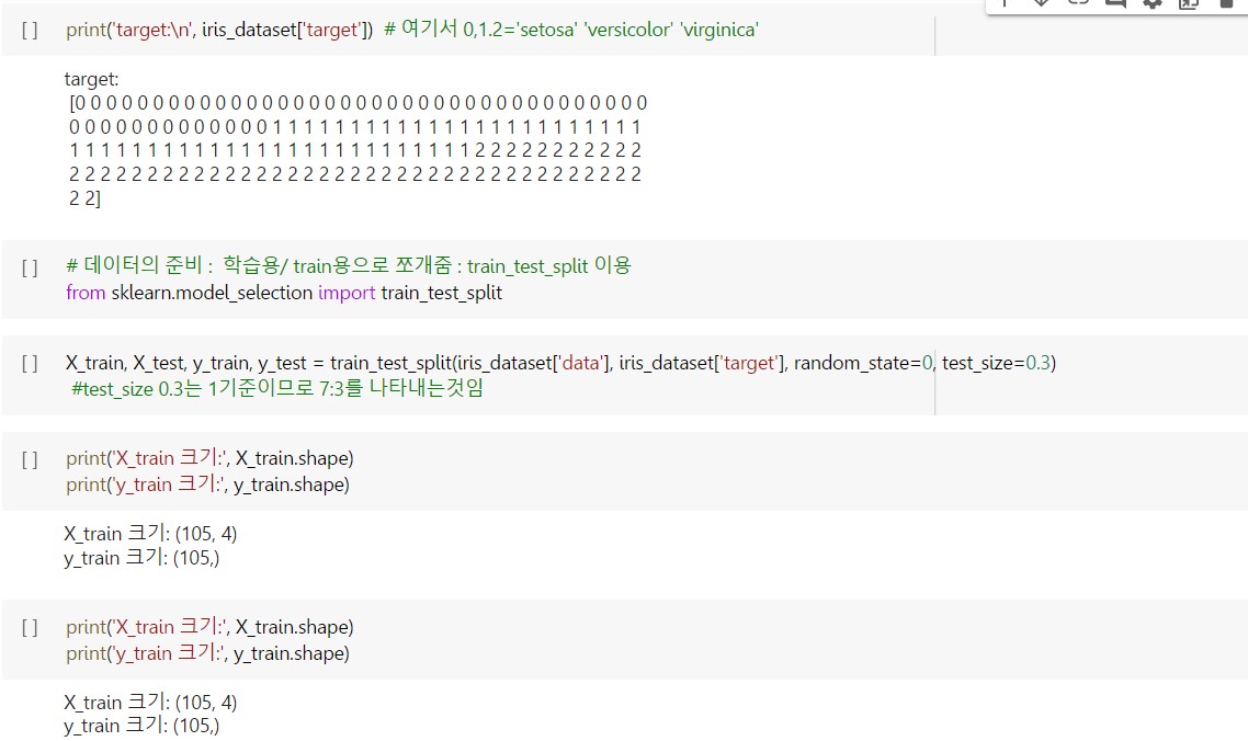 붓꽃 iris 데이터를 학습에 사용하기 위해, 학습용 데이터와 테스트 데이터로 나눠서 사용한다 (X_train, X_test, y-train, y-test)
