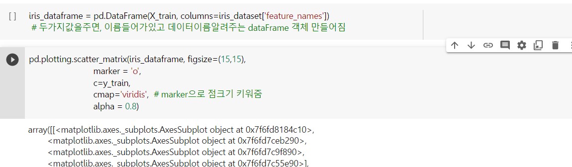 열의 이름은 iris_dataset.feature_names에 있는 문자열 사용 / 두번째 박스의 코드를 보면, 데이터프레임을 사용해 y_train에 따라 색으로 구분된 산점도 행렬을 생성하라는것을 볼수있음