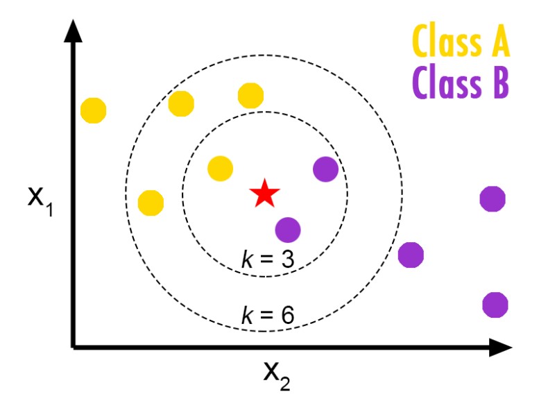 - 테스트 데이터인 빨간 별 에서부터 가장 가까운 학습데이터들의 클래스를 살펴본 후, 그중 더 많은 수가 속해있는 클래스가 테스트데이터의 클래스로 결정이 된다.