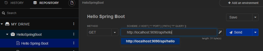 2. 설치했던 확장프로그램인 Talend API Tester 들어가서 +Project > +Add a request 한 후, 위 코드에 있는 주소(http://localhost:9090/api/hello) 붙여넣고