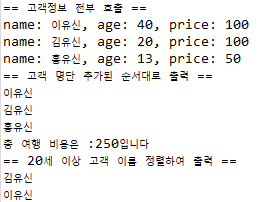 System.out.println("== 20세 이상 고객 이름 정렬하여 출력 ==");