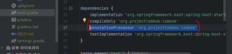 만약 프로젝트 생성시 롬복선택하는거 까먹었다면 그래들파일에서 아래 해당 부분 설정 해줘야됨