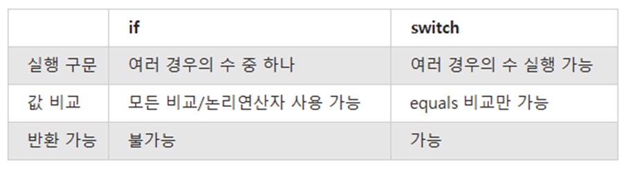 조건문 : if – else if – else : 경우의 수 중 하나 / switch : 실행 흐름의 분리