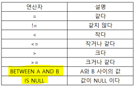 - WHERE을 쓰지않고 AND를 쓰게되면, 에러발생함. 반드시 WHERE 이후에 AND, OR 써줘야함