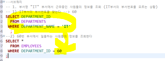 -- 문제 : 부서명 "IT" 부서에서 근무중인 사원들의 정보를 조회 (IT부서의 부서번호를 모르는 상황)