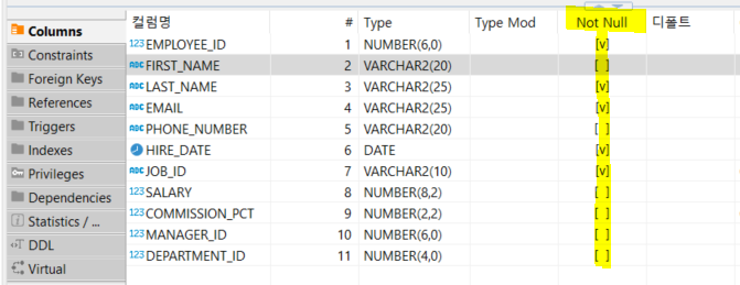 - 만약 NULL 체크 되어있는 컬럼에 NULL값 넣으면 : 'ORA-01400'에러 발생함