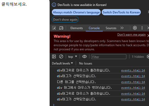 onmouseover="console.log('div태그위로 마우스가 올라왔습니다.')"