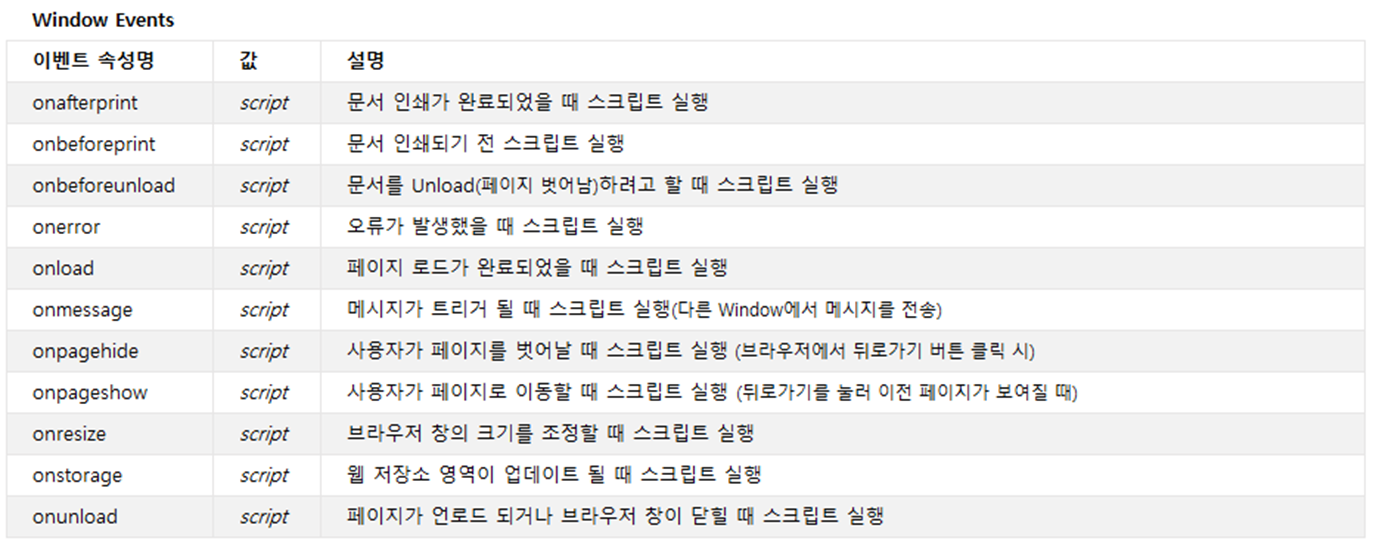 - onbeforeunload / onunload : 보안문제로 이제는 사용하지않음