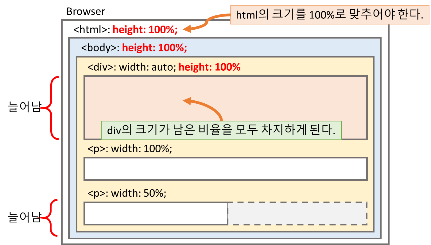 - width 는 100%를 줄 수 있지만, height는 100% 주기 힘들다