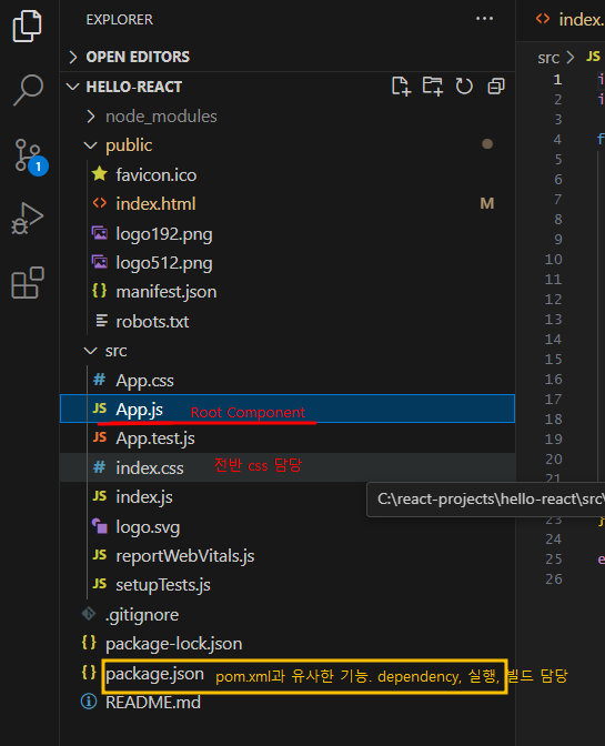 Reacct의 관례상, App.js의 App 컴포넌트는 Root Component가 됨
