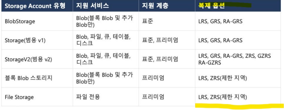 - RA-GZRS 읽기 엑세스 지역 영역 중복 스토리지 : 데이터는 세개의 가용성영역에걸쳐 복제되고 지역쌍에대한 읽기-엑세스로 복제됨