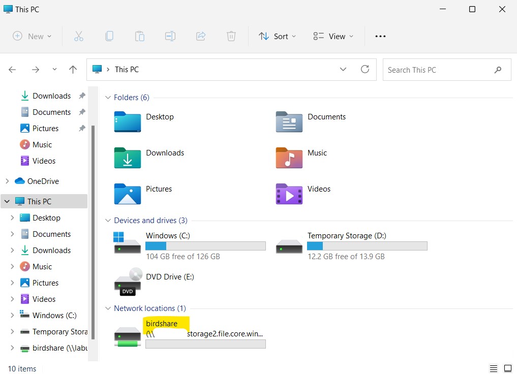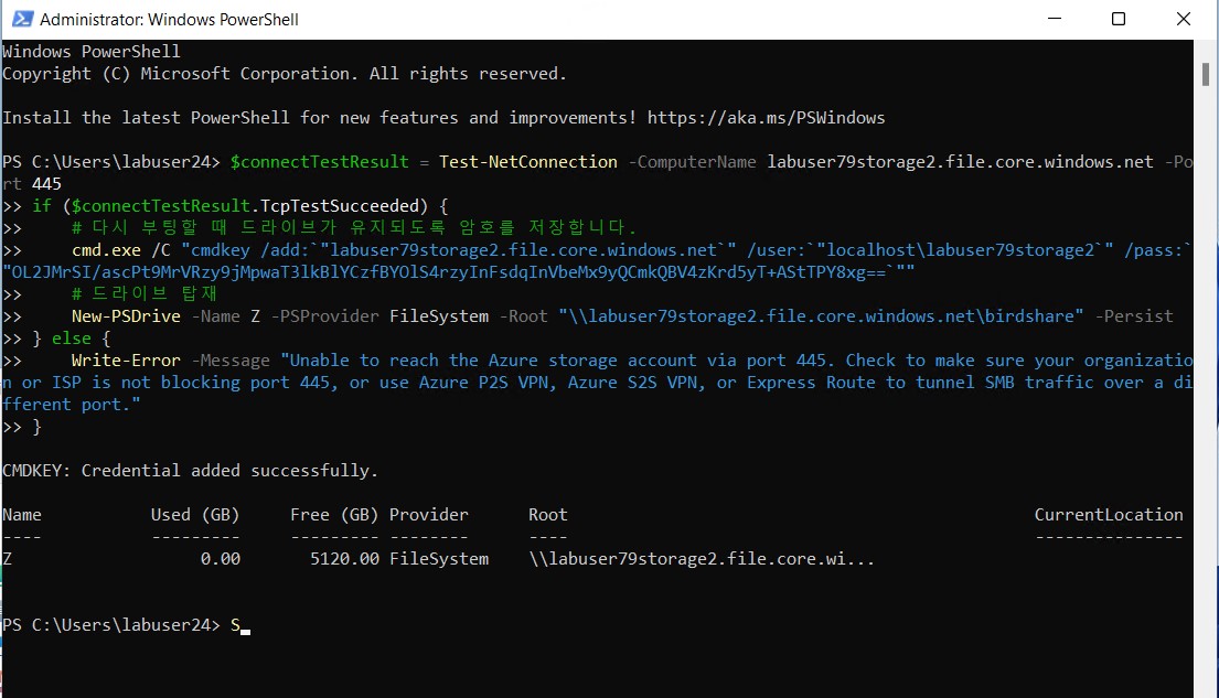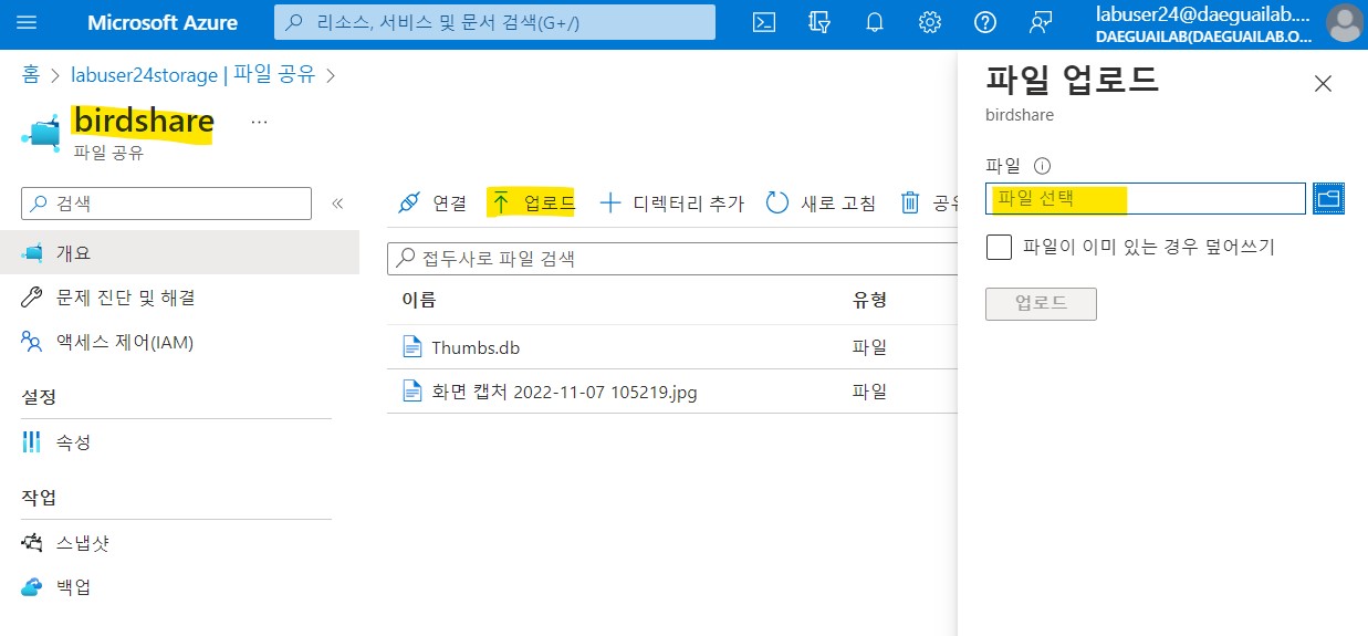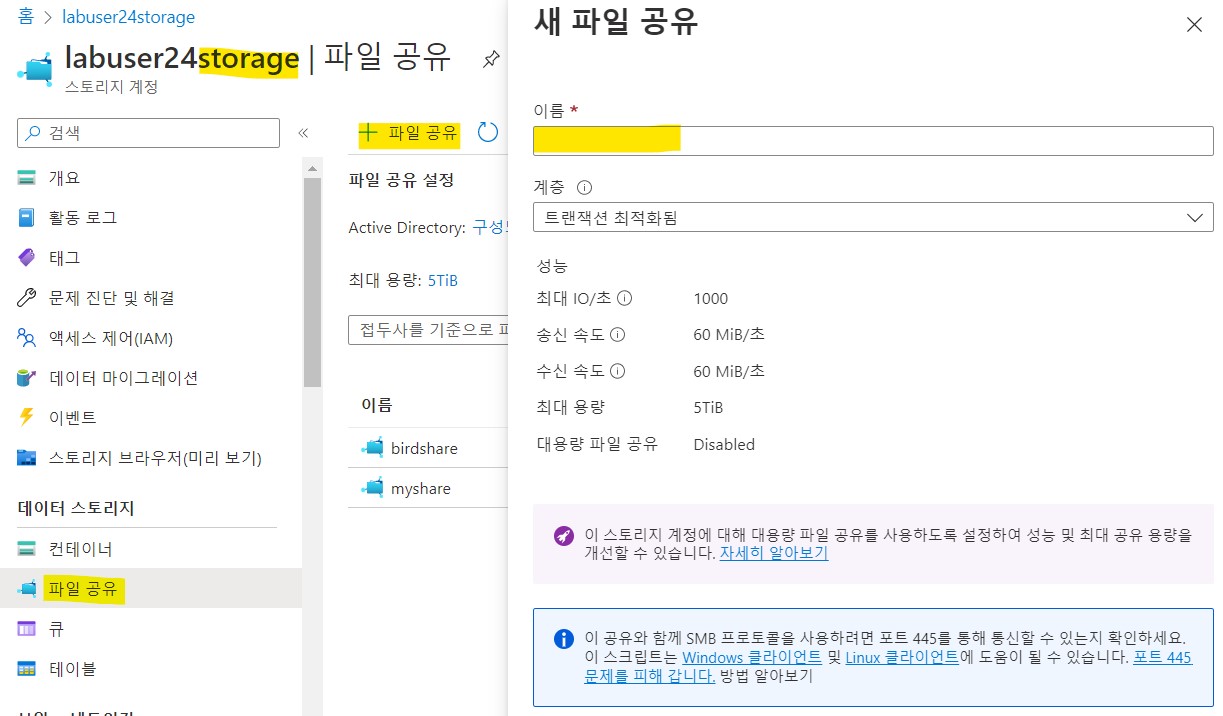 0. storage 계정 - 파일공유 - 새파일공유 - 'birdshare' 라는 파일 만들기