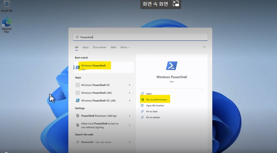 5. 가상머신안에서 'power shell' 검색하고, '관리자권한으로 실행' -> 여기에 위의 2번째 순서에서 복사한 script 붙여넣기