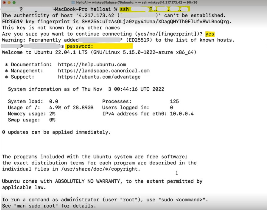 3. prompt창 켜서(맥의경우 terminal) 복붙한거 입력해주고 (2-1사진에서면-i <private key path>) 부분 삭제해준다