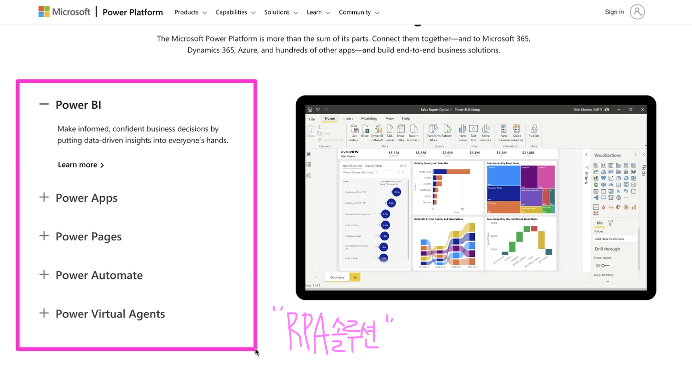 Microsoft Power Platform에 포함된 Power BI, Power Apps, Power Automate, Power Virtual Agents를 사용하여 데이터 기반의 비즈니스 솔루션을 빠르게 구축하세요.