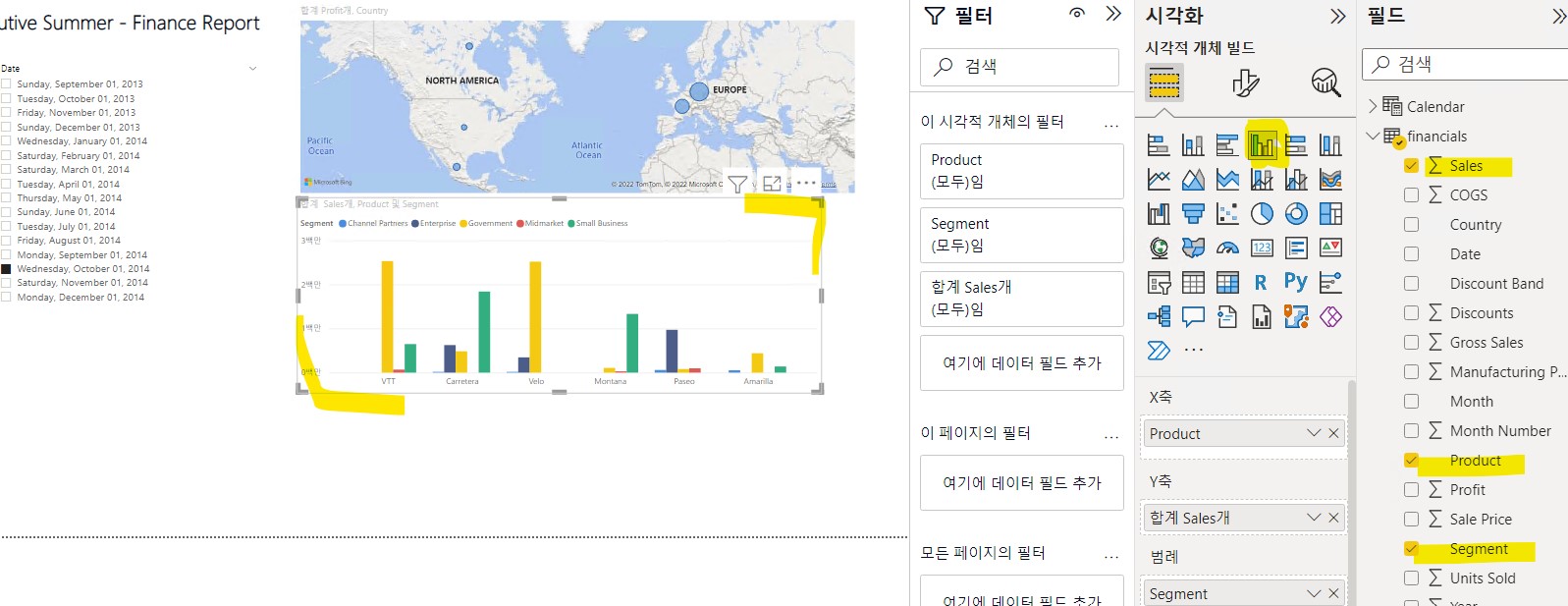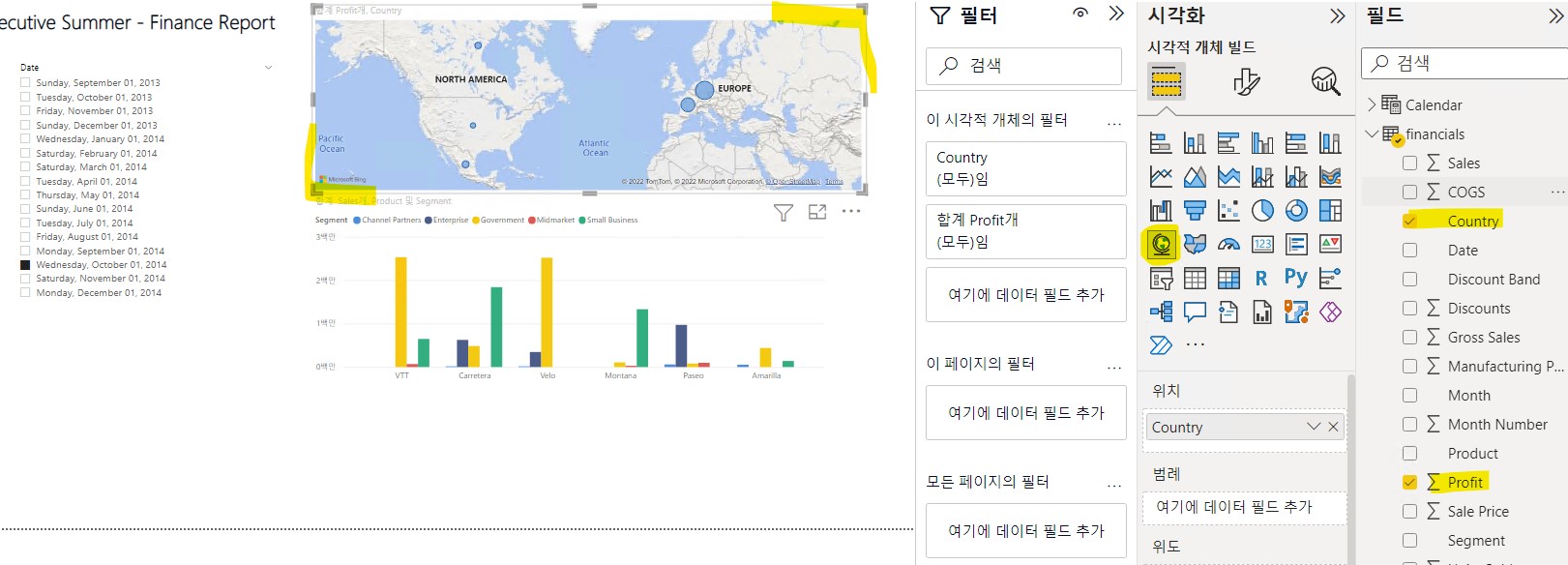 아래의 이미지들에서는 각각의 표시된 부분을 만들때 어떤 시각화 아이콘과 필드항목이 선택되었는지 볼수있다.