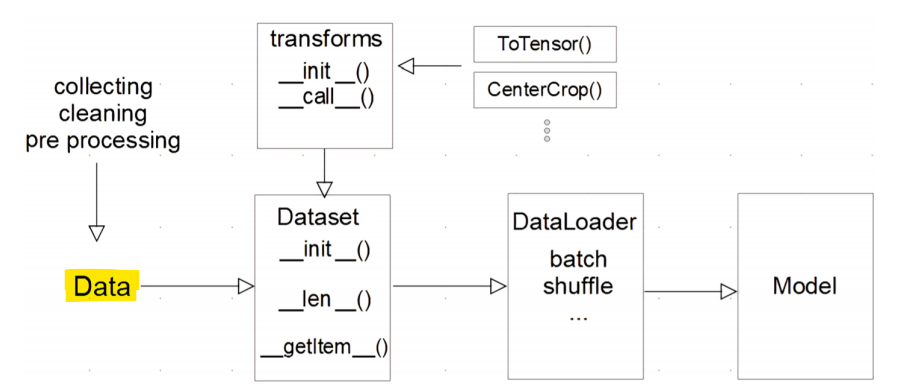 - __getitem__() : 데이터와 레이블을 반환, dataloader에서 호출됨, 단일데이터포인트(**텐서**, 넘파이 배열)에 대한 특정유형을 반환 ==> augmentation을 먹인 후 마지막에는 텐서형태를 띄어야 한다.(ToTensor() 해주기)