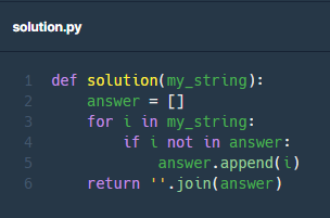 3줄~5줄 - i가 my_string 문자열을 도는데, 이 값이 answer리스트안에 있는 값과 같지 않다면(중복값이 아니라면) answer에 i값을 추가한다.