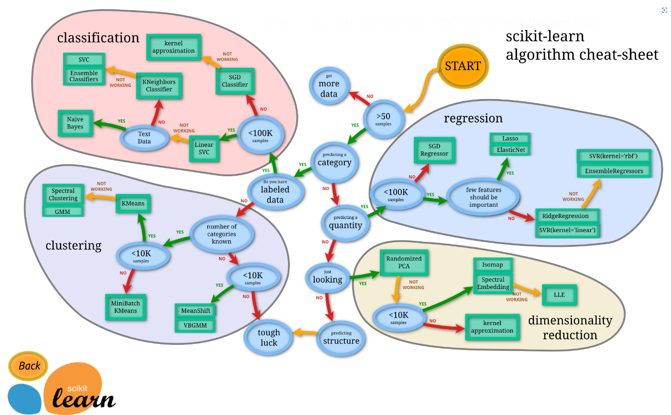 머신러닝 구현시, 적합한 알고리즘을 선택하는것이 고민될 때가 많을텐데, 이런 상황에서는 아래 'scikit-learn algorithm cheat-sheet를 이용하면 도움을 받을수있을것이다.