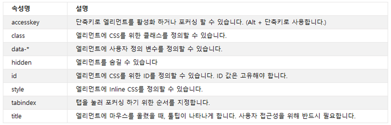 - 모든 태그에 쓸수있는 속성들 (java script에서 쓰기위한 용도)